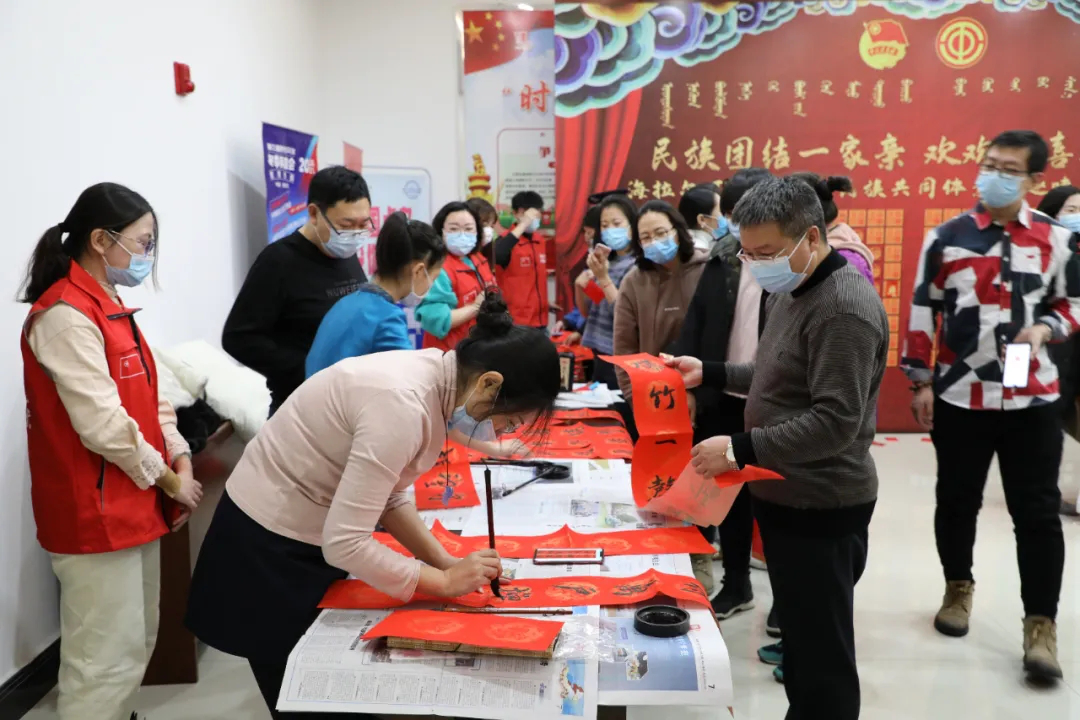 答题活动严格遵守疫情防控相关要求,设置人员分区、分流参与,通过扫码线上回答民族团结小知识抽取幸运红包,兑换新春对联的形式开展。活动特邀海拉尔区书法协会主席、理事及少先队员代表现场挥毫泼墨,为大家书写对联、福字等。活动得到大家的积极参与,很多单位还以主题党日形式集体参与挑战,既增长巩固了干部职工关于民族团结知识的储备,又弘扬了中华传统文化,为大家送去了新春的祝福。