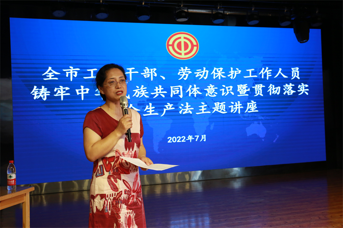为加强对工会干部职工的思想政治引领,引导广大职工听党话、跟党走,进一步推动安全生产工作责任落实,增强广大干部职工的安全生产意识,7月15日,锡林浩特市总工会举办企业工会主席、劳动保护工作人员铸牢中华民族共同体意识暨安全生产法主题讲座。本次讲座特邀市委党校副校长、锡盟委铸牢中华民族共同体意识宣讲团成员、锡林浩特市总工会劳模志愿服务队宣讲员白丽老师和市委党校讲师、锡林浩特市理论学习轻骑兵宣讲队员乌日乐格老师授课,全市68名企业工会主席与劳动保护监督检查员和安全员聆听讲座。