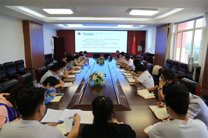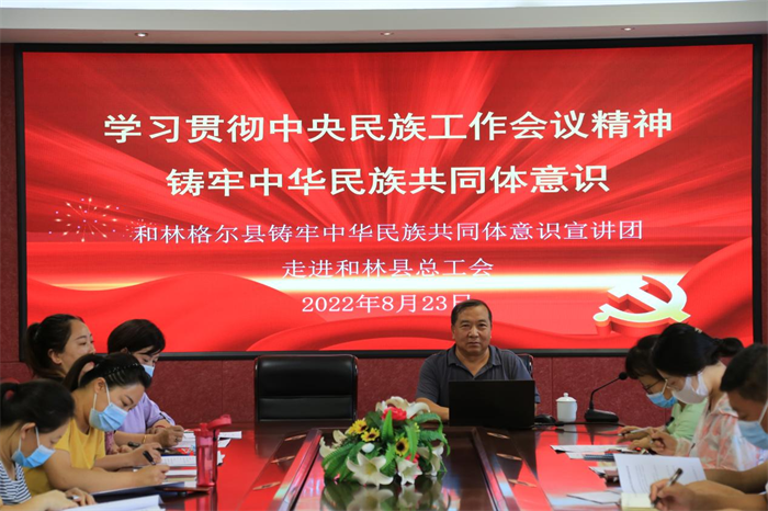 为迎接党的二十大胜利召开,大力营造团结奋斗、自信自强的浓厚氛围,推进民族团结进步创建工作深入开展,8月23日,和林格尔县总工会党组理论学习中心组学习会邀请县委党校副教授、教务处主任郭锁旺老师作《铸牢中华民族共同体意识,推进新时代民族工作高质量发展》主题宣讲。县总工会党组书记伊俊文主持会议。