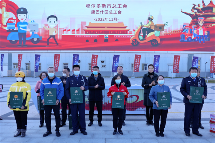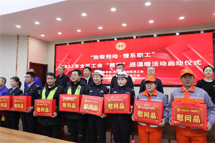 2022年全区工会“两节”送温暖活动在呼和浩特启动,为劳动模范、困难职工、环卫职工、快递员等一线职工代表发放慰问品