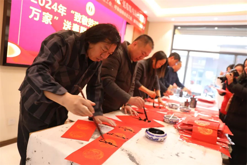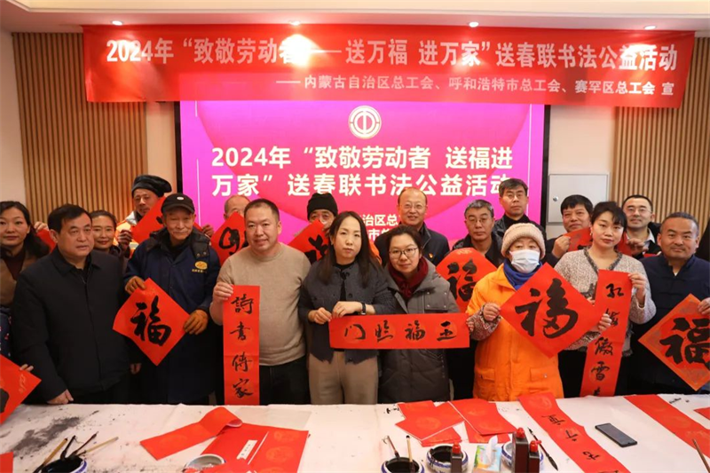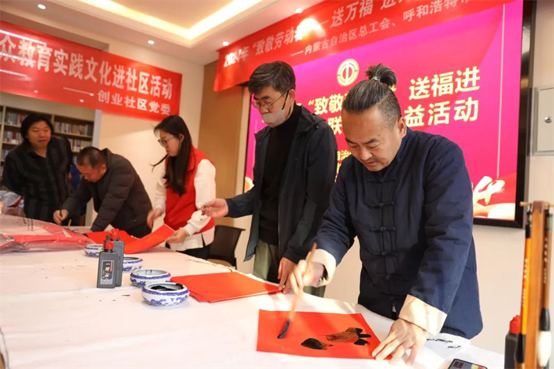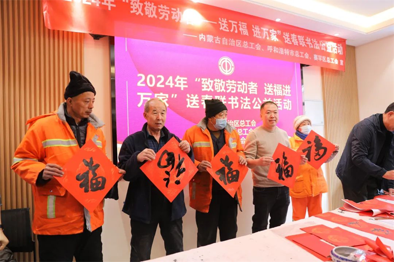 翰墨迎新春,送福入万家。为进一步铸牢中华民族共同体意识,充分发挥工会组织优势,更好地关心关爱环卫工人等户外劳动者群体,让他们过一个欢乐祥和、幸福美满的新春佳节,1月30日,自治区总工会、内蒙古书法家协会与呼和浩特市总工会、赛罕区总工会联合开展“致敬劳动者——送万福进万家”送春联书法公益活动,组织知名书法家来到位于创业路的工会驿站现场书写春联和福字,为环卫工人、社区居民送去春联和祝“福”。