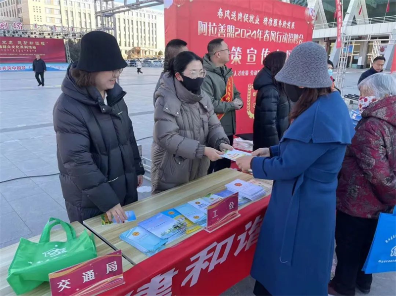 阿拉善盟工会在现场设立了政策咨询服务台,工会法律援助律师及工作人员向过往求职者和群众提供法律、政策咨询服务以及就业创业指导等服务,求职者在自身合法权益受到侵害时,可以向工会寻求帮助。盟工会共接受咨询近100人次,发放《工会法》《中国工会章程》《职工维权手册》等宣传资料200余份。