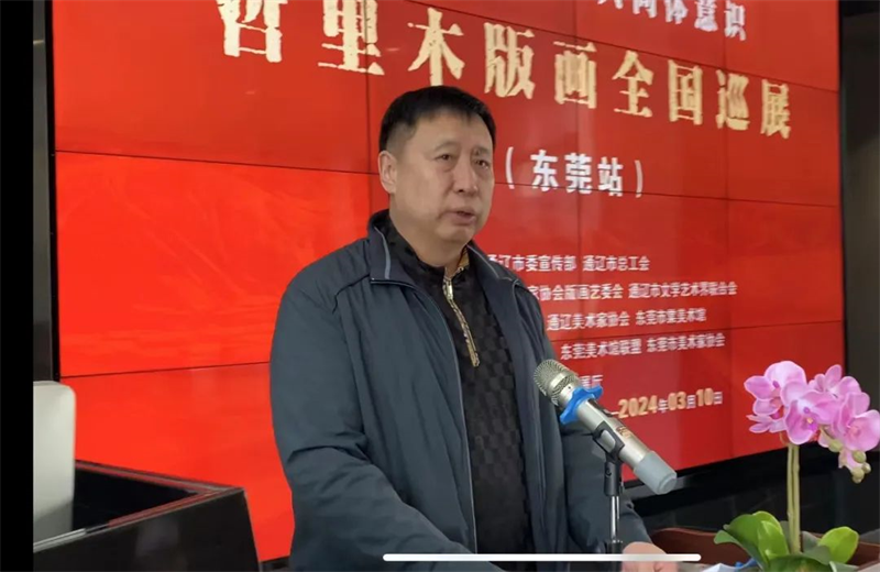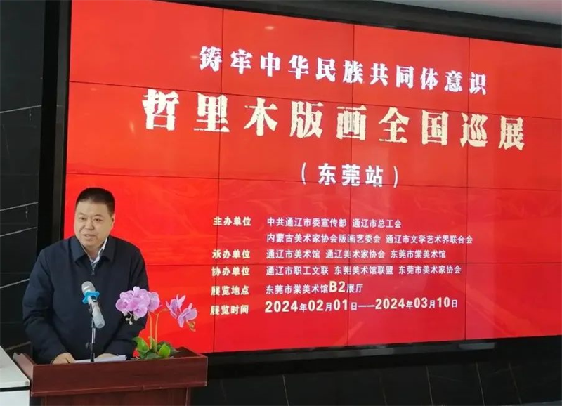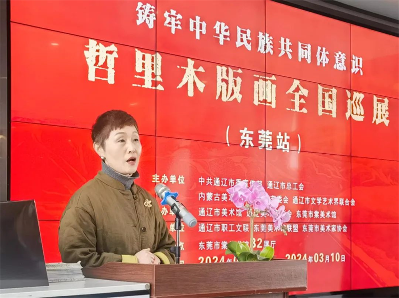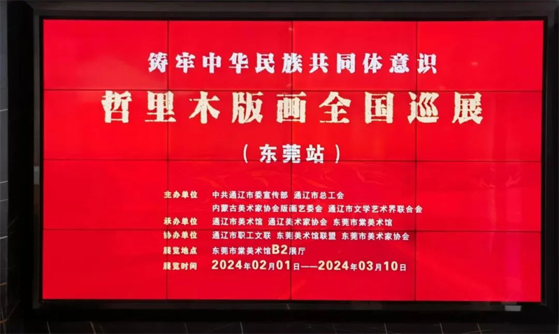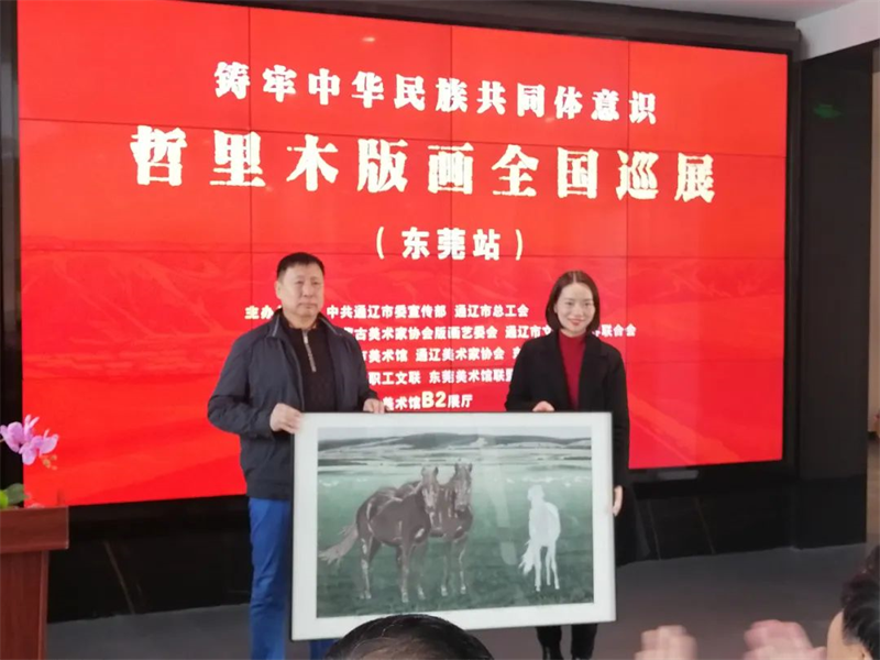 为深入贯彻落实习近平总书记考察内蒙古重要讲话精神,推动总书记交给内蒙古的五大任务及全方位建设“模范自治区”的要求落实落地,深入学习贯彻习近平新时代中国特色社会主义思想,促进两地文化交往交流交融,奋力谱写靓丽北疆文化事业发展新篇章。3月2日,“铸牢中华民族共同体意识”哲里木版画全国巡展在广东省东莞市棠美术馆隆重开展。