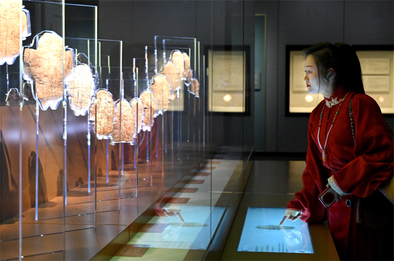 ▲参观者在河南安阳殷墟博物馆新馆内观看展出的刻辞卜甲。 新华社记者 李安摄
