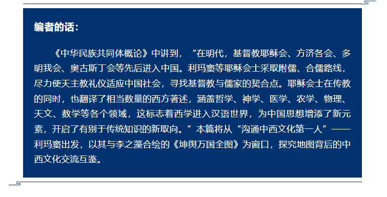 中国是一个有着悠久制图传统的国度。中国古代进行了大量的舆图编绘实践,产生了许多重要成果。既有全国性总图《禹迹图》《广舆图》,也有地方性地图。明清之际,有这样一幅地图,它采用当时先进的制图方法,同时充分结合中国国情,这就是中国士大夫李之藻与传教士利玛窦合作绘制的《坤舆万国全图》。