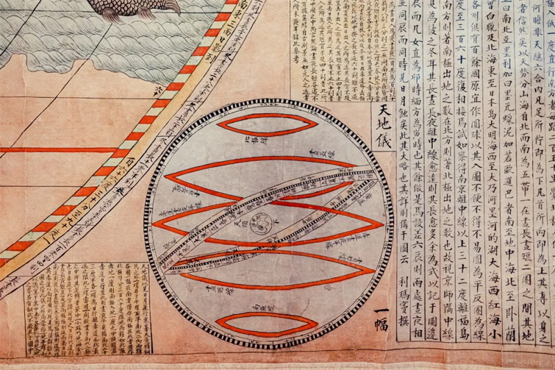 图的四个角有天文图和地理图,右上角画有《九重天图》,右下角为《天地仪图》,左上角是《赤道北地半球图》和《日月食图》,左下角曾有《赤道南地半球图》和《中气图》,这些辅助小图包含了天文、地理方面的知识,开拓了当时国人的眼界。虽然这些知识在今天已经是人尽皆知的常识,但在明代可谓耳目一新。例如,这幅地图所表现的地球是一个圆球,某种程度上冲击了中国传统上“天圆地方”的天地观。