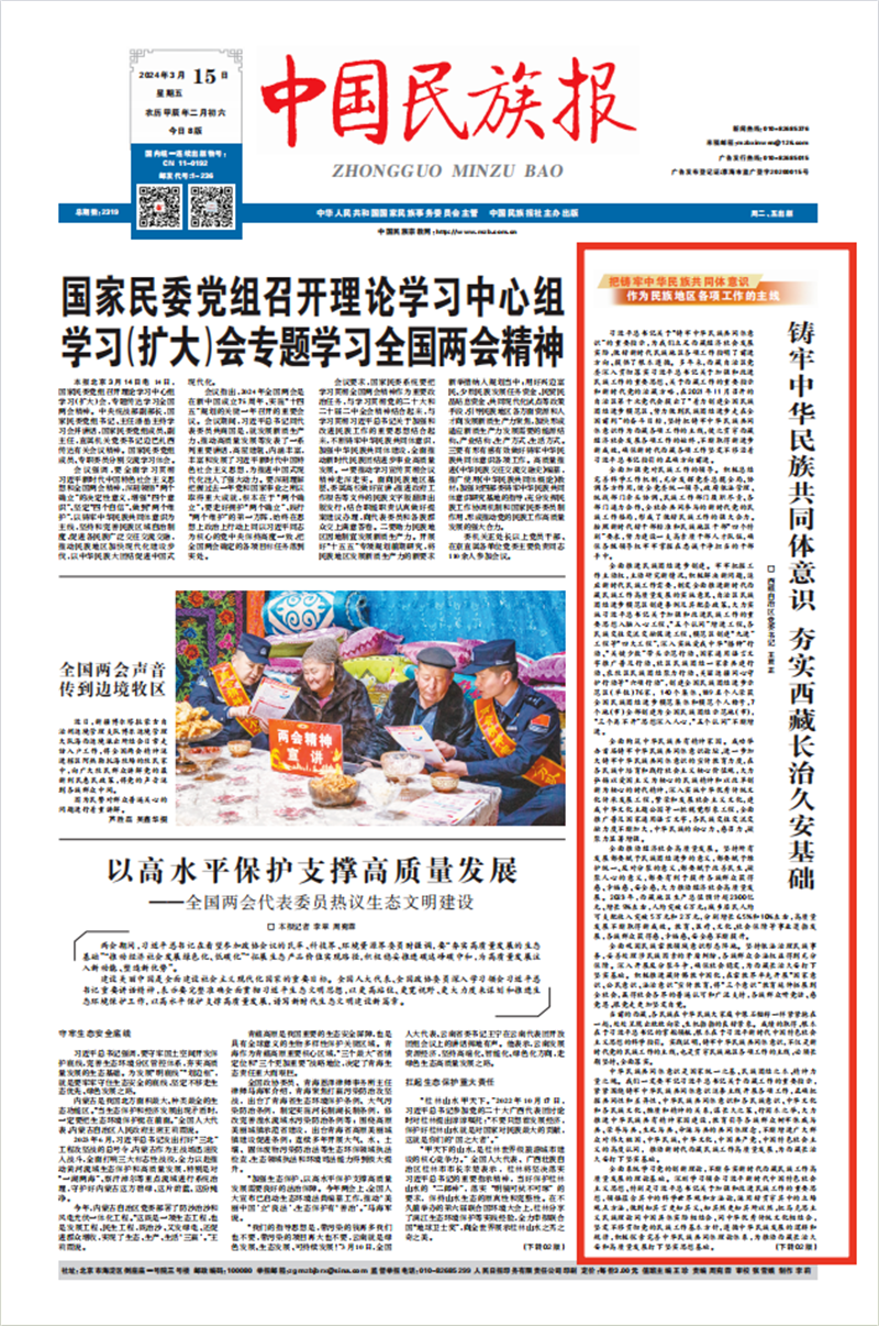 ▲3月15日,《中国民族报》刊发西藏自治区党委书记王君正的署名文章
