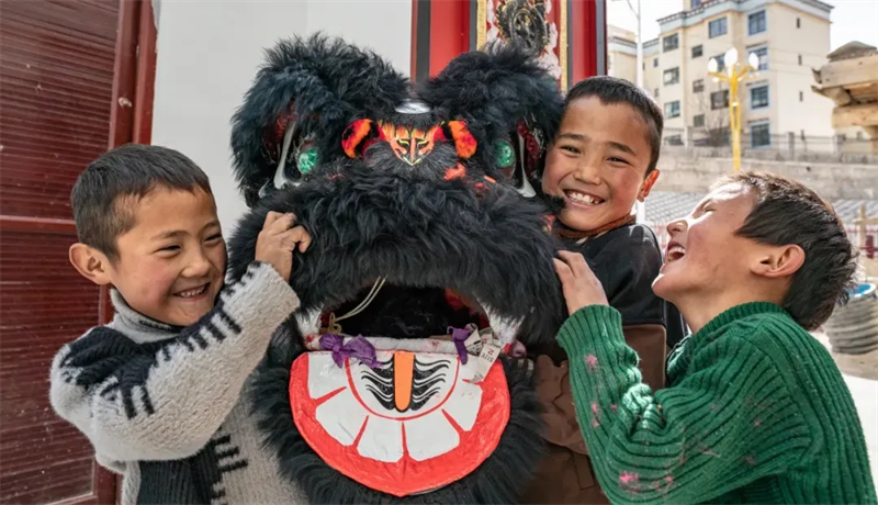 ▲在西藏昌都市洛隆县硕督镇硕督村,孩子们手捧狮子舞道具玩耍