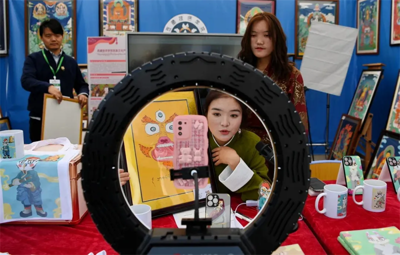 ▲西藏技师学院学生直播展示师生制作的手工艺品。 (新华社记者 张汝锋 摄)