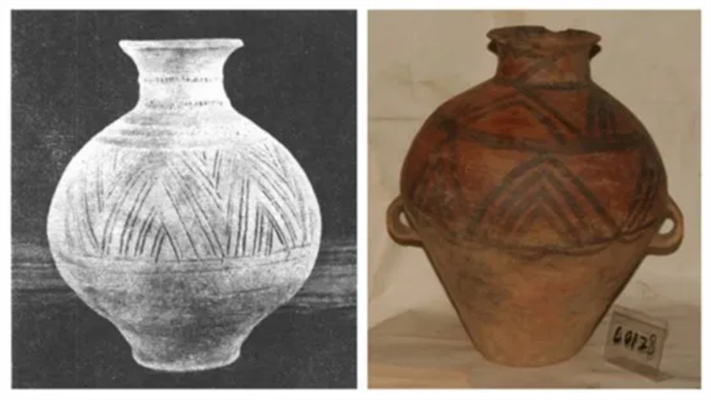 右图为甘肃马家窑文化三角折线纹彩陶壶(图片来源:马家窑文化官网)