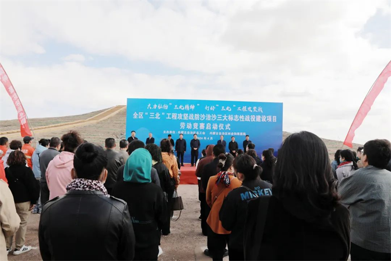 为全面贯彻落实习近平总书记重要指示精神,在自治区实施“六个工程”中贡献工会力量,4月29日,自治区总工会与自治区林业和草原局在巴彦淖尔市磴口县乌兰布和沙漠综合治理工程项目区隆重启动大力弘扬“三北精神”,打好“三北”工程攻坚战2024年内蒙古自治区“三北”工程攻坚战防沙治沙三大标志性战役建设项目劳动竞赛,自治区总工会党组书记、副主席张慧宇讲话,自治区总工会党组成员、经审会主任李锋杰主持启动仪式,自治区林业和草原局党组成员、副局长陈永泉讲话,巴彦淖尔市人大常委会副主任、市总工会主席尹兆平致辞,巴彦淖尔市林业和草原局局长陈海维讲话,内蒙古金丰农牧林生物科技有限公司经理孙文明代表参赛企业发言,磴口县防沙林场二作业区护林员金振云宣读倡议书。