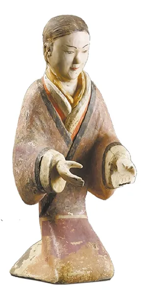 因为缺乏实物资料,现在学界对于汉代深衣的具体形制还存在一定争议。已故著名文物专家、考古学家孙机在《深衣与楚服》一文中提出,“着深衣者有男子,也有妇女,但不论国别如何,性别如何,这种服式的共同特点是:都有一幅向后拥掩的曲裾”。可见,“曲裾”是汉代深衣的一类服式。“裾”,通俗来讲就是指衣服边,“曲裾”就是衣边弯曲缠绕的深衣。