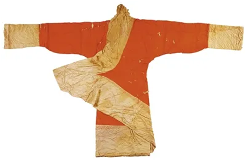 ▲西汉朱红菱纹罗曲裾式丝绵袍。