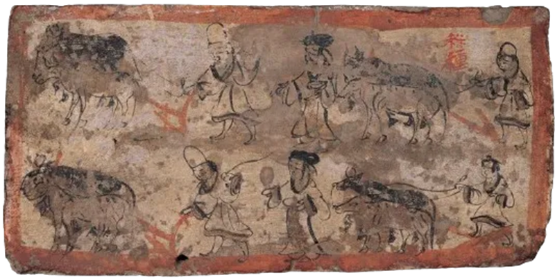 ▲“耕种图”壁画砖(图片来源:甘肃省博物馆)