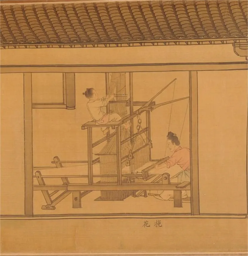 《蚕织图》细致地记录了宋代时,自“腊月浴蚕”到“下机入箱”的古代蚕织生产技术。图中的挽花机是织造的重要工具,挽花机前,有一端坐的妇女正在全神贯注地操机挽提,机上方坐着一个光着脚的小孩,正憋足了力气挽提经线,努力到“翘脚趾”,好像在说:“看,我也能帮忙呢!”