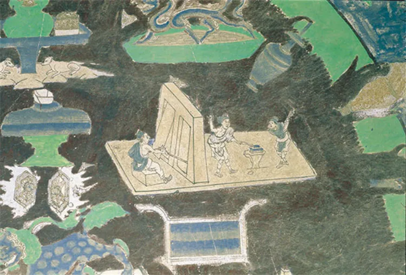 ▲榆林窟第3窟东壁—五十一面观音变之风箱与冶铁图(西夏)(图片来源:敦煌研究院)