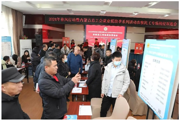 依托“小驿站”,助力就业创业“大民生”。3月2日,自治区总工会在呼和浩特市乌兰察布务工人员之家举行2024年春风行动暨内蒙古总工会就业援助季系列活动农牧民工专场岗位双选会。招聘会现场热火朝天,人头攒动,整齐划一的招聘展位,醒目的岗位需求表,各大企业纷纷亮出招牌,积极沟通开启“抢人”模式;求职者们穿梭其中,不时与招聘企业人员互动详聊工作内容、专业要求、待遇福利等问题。此次活动共有23家对口企业进场招聘,提供服务行业、生产操作、一线技工等就业岗位135个,招聘800余人。入场求职者237人,现场投递简历97份,达成初步就业意向32人。