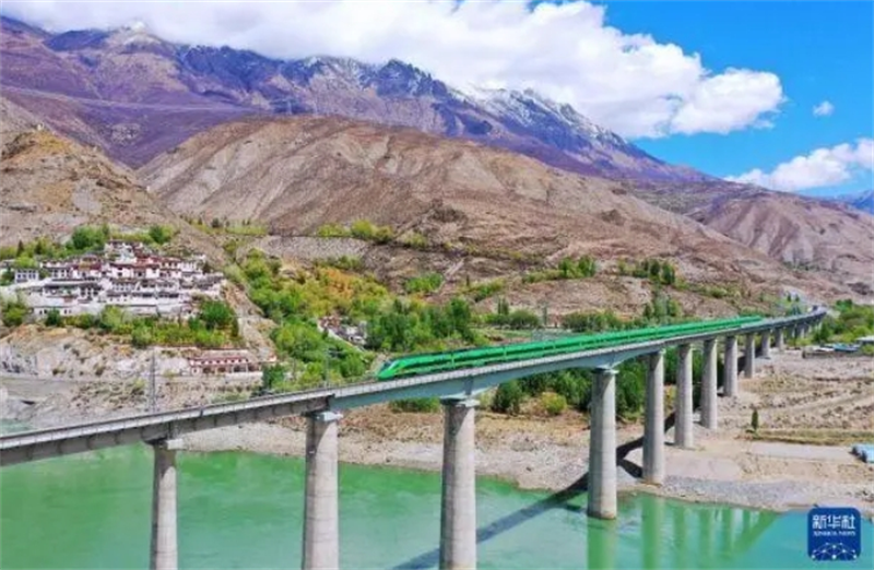 ▲2022年4月14日,复兴号列车行驶在西藏朗县境内。