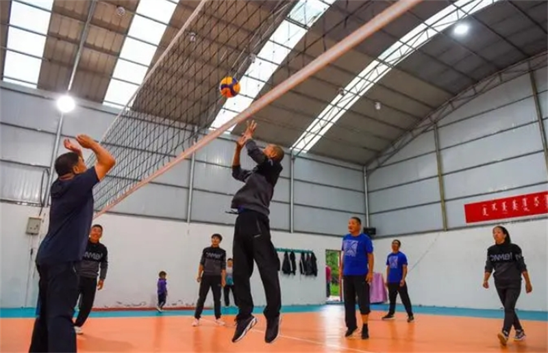 ▲在内蒙古鄂尔多斯市鄂托克前旗昂素镇的草原上,近年来流行起了一股“排球热”。这是农牧民们在排球馆内打球。