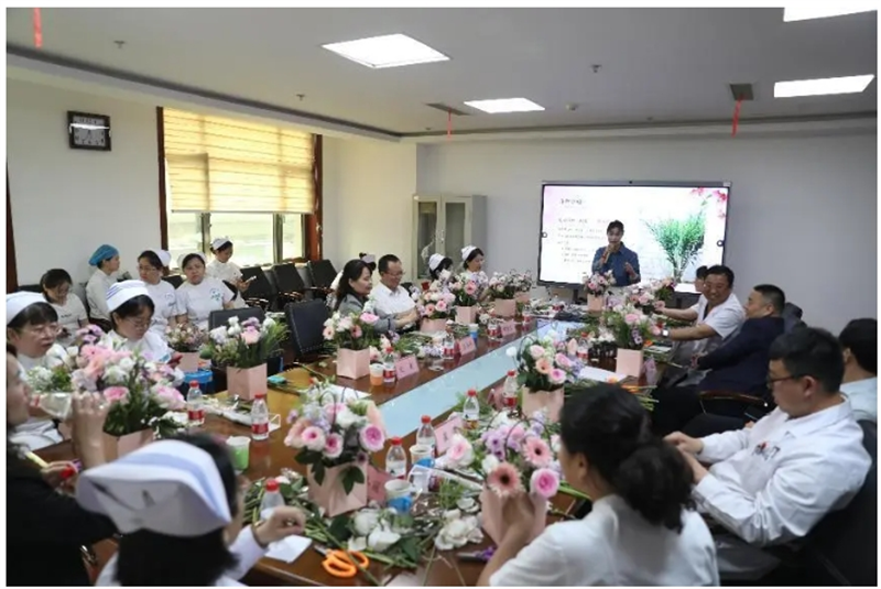 为庆祝护士节,此次慰问还安排了文艺演出和插花活动。内蒙古医科大学附属肿瘤医院(北京大学肿瘤医院内蒙古医院)的护士长和护士代表为大家表演精彩的文艺节目,现场气氛热烈,歌声悠扬,欢声笑语不绝于耳。在插花活动中,专业花艺师从花材、养护、色彩搭配等方面,对插花的基本方法进行现场讲解和演示。白衣天使们把各式各样的花材制作成一个个别致精美的作品。参加活动的护士代表纷纷表示:“今天不仅学到了插花知识,还在繁忙的工作中舒缓了压力,享受了插花的乐趣。”