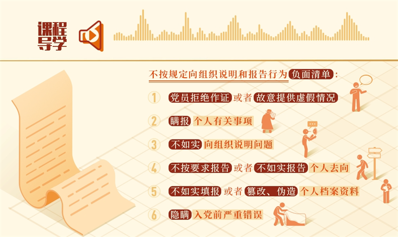 《中国共产党纪律处分条例》第八十条、八十一条,对不按规定向组织说明和报告行为作出了处分规定,主要包括6类:
