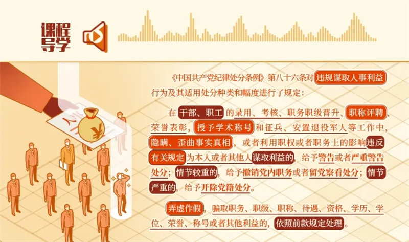 在干部、职工的录用、考核、职务职级晋升、职称评聘、荣誉表彰,授予学术称号和征兵、安置退役军人等工作中,隐瞒、歪曲事实真相,或者利用职权或者职务上的影响违反有关规定为本人或者其他人谋取利益的,给予警告或者严重警告处分;情节较重的,给予撤销党内职务或者留党察看处分;情节严重的,给予开除党籍处分。