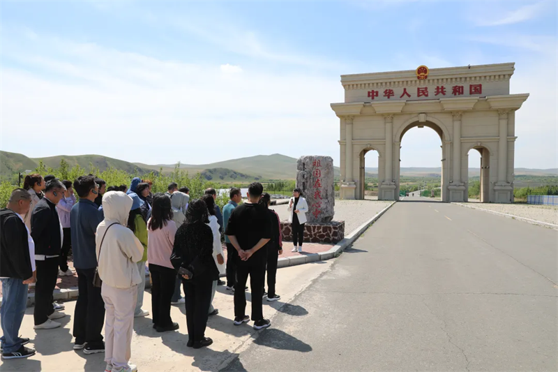 学员们来到阿尔山口岸国门,近距离感受边境国门的威严。步入国门景区,可以看到宏伟壮观的国门,高高伫立在蓝天之下、草原之上,国门乳白色的门体上嵌着“中华人民共和国”七个鲜红大字,正中悬挂国徽,庄严肃穆,旁边矗立的石碑上刻有“祖国在我心中”,站在此处,国门全貌和广袤的背景尽收眼底,尽显巍然气势,令人心潮澎湃,爱国之情油然而生。