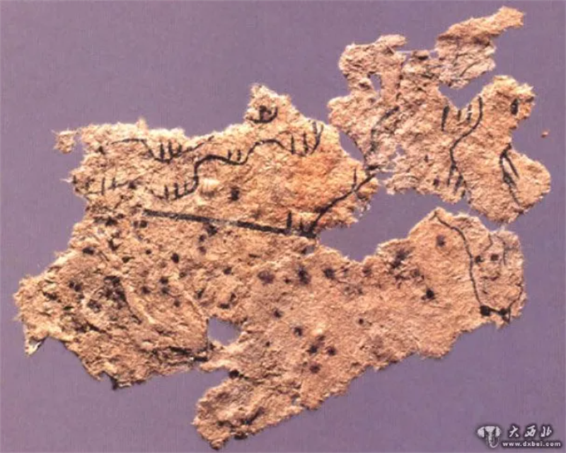 ▲天水放马滩西汉墓出土的纸质地图残片(图片来源:大西北网)