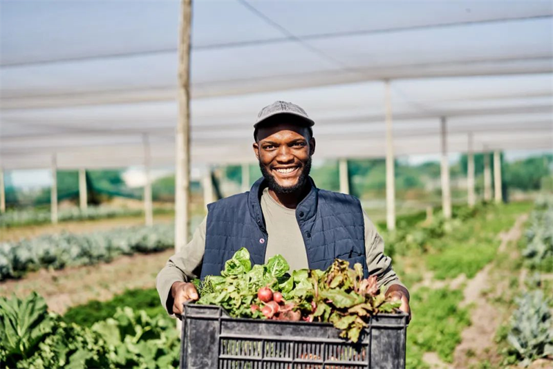▲在非洲一个可持续的农场里,抱着装满了新鲜农产品的青年(图片来源:视觉中国)
