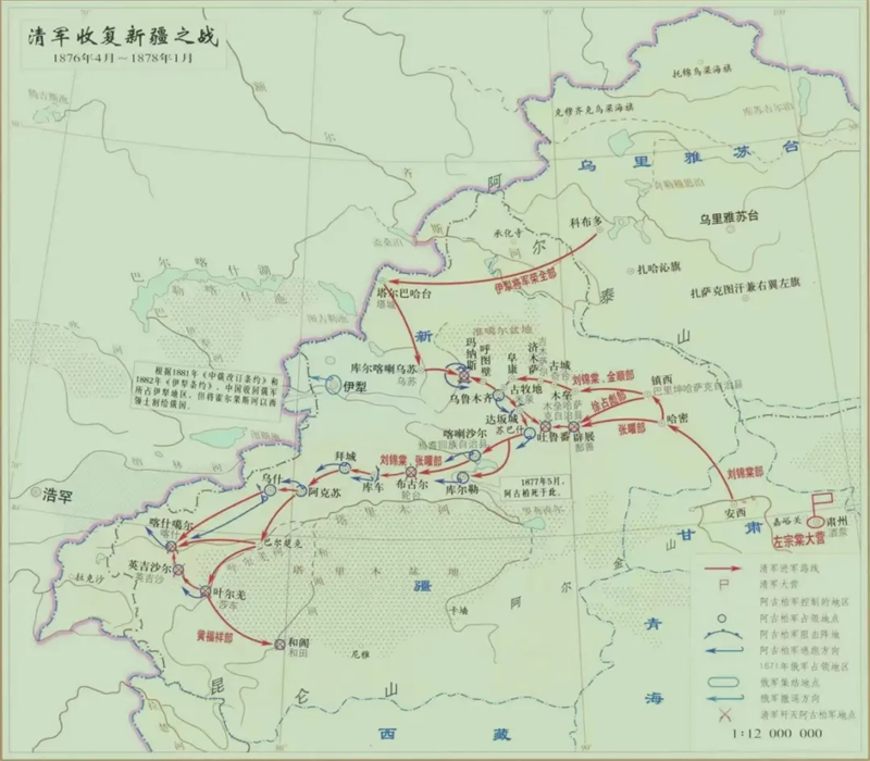 ▲清军收复新疆之战进军路线图。(图片来源:《中国战争史地图集》)