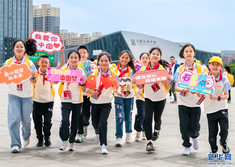 ▲各族少年儿童代表在“ 红领巾爱祖国 石榴籽一家亲”全国各族少年儿童“六一”赴内蒙古、