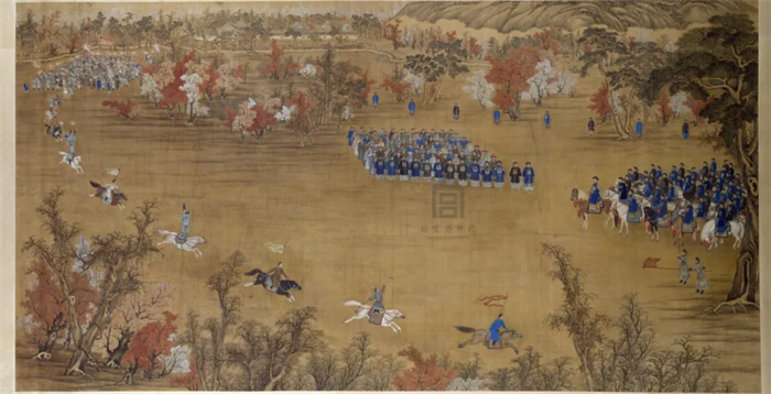 到了明清,骑术表演除了民间,还作为军队训练的一项重要内容,清宫画家郎世宁曾经描绘了一幅反映清军进行马术训练的《马术图》,表现了清军在马术训练当中的各种动作、各种方式,非常引人入胜。