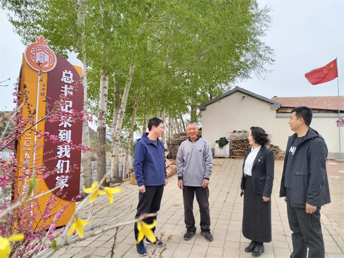 ▲邻近张国利(左二)家院子的道路旁,立着一块两米多高的牌匾,写着:“总书记来到我们家”。图源:中国民族报