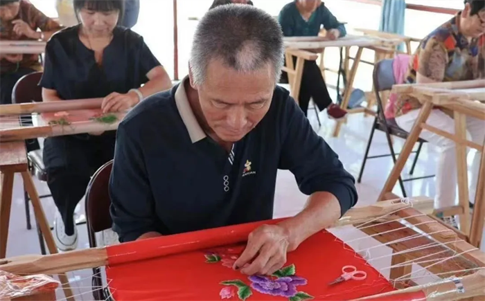 ▲科尔沁右翼中旗蒙古族刺绣产业园车间,绣工们在忙碌。图源:中国民族报