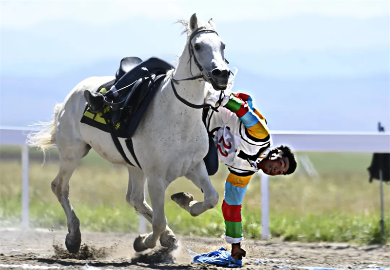 ▲西藏代表团运动员旦增尼玛和赛马“隆达尕布”参与 跑马拾哈达比赛。(王京广摄)