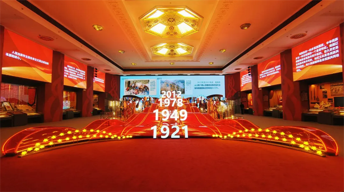 “大团结”单元设在民族文化宫一楼正中的大厅。拾级而上,展厅中间核心区域是象征思想伟力的红旗造型,1921、1949、1978、2012年各代表性年份矗立波浪之上,层层推高的波浪代表着党在蜿蜒起伏的历史长河中带领全国各族人民走向新时代。波浪后方,是一个用各民族乐器精心打造的“乐器墙”,意为“万方乐奏”,寓意各族人民心向党、中华民族大团结。