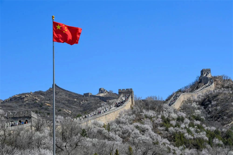 ▲2024年4月7日,游客在山花盛开的八达岭长城观光游览。新华社记者 鞠焕宗 摄