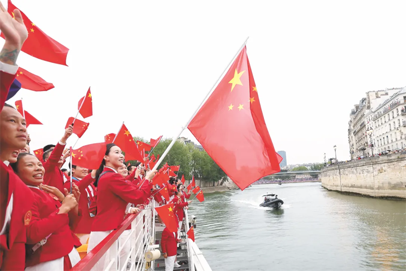 ▲7月26日,中国体育代表团旗手、花样游泳选手冯雨在开幕式上挥舞国旗。当日,第33届夏季奥林匹克运动会开幕式在法国巴黎举行。新华社记者 曹灿 摄