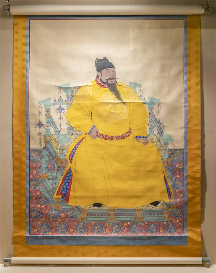 画像中,朱棣身穿明黄龙袍,端坐于青绿嵌玉宝座之上,右手握腰带,左手撑在腿上,面目肃穆,似怀治国安邦之忧思。这幅画采用了典型的汉地帝王肖像画技法,勾勒敷色,刻画入微。从制作工艺来看,其镶边并不完全是传统帝王肖像画的装裱形式,更像是有着多层装裱的唐卡。