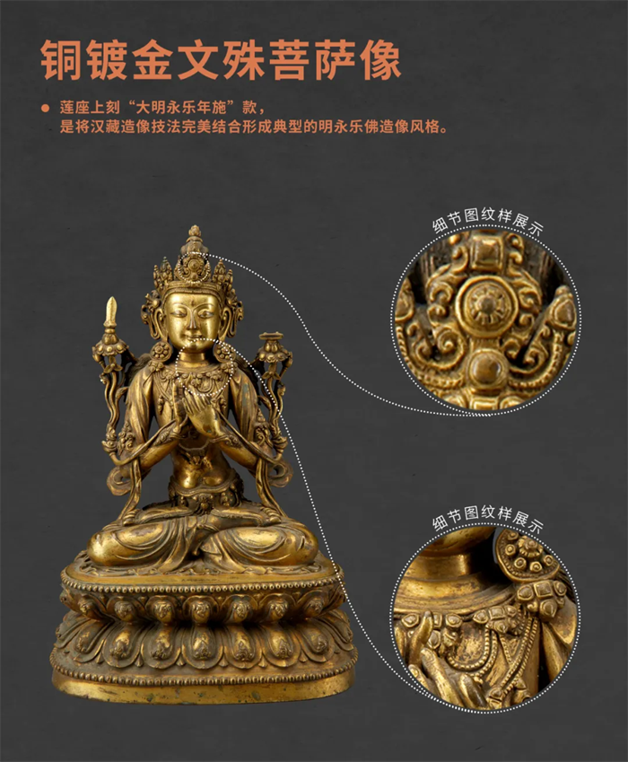 ▲铜镀金文殊菩萨像,莲座上刻“大明永乐年施”款,是将汉藏造像技法完美结合形成典型的明永乐佛造像风格。(图片来源:故宫博物院官网)