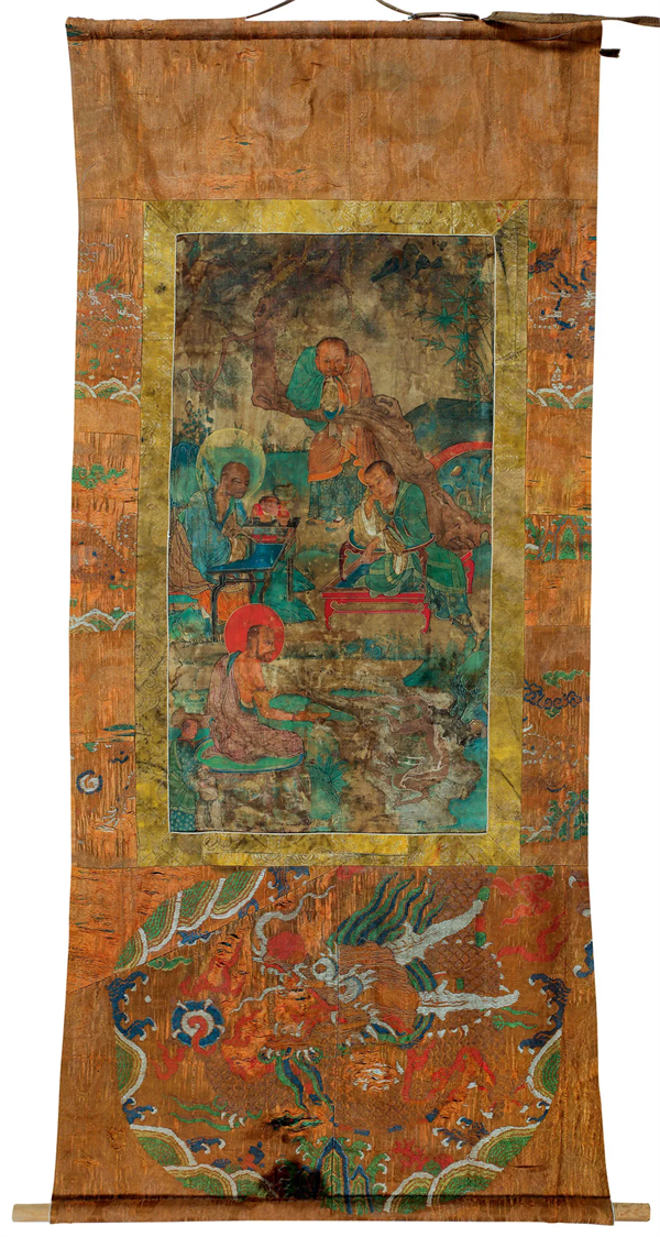 以2018年保利国际拍卖中的“明代罗汉图唐卡”为例,画中罗汉表现出淡雅高远的传神形象,具有写实人物特征,人物造型比例也与汉地绘画极为相似。裱边及唐门采用了盘龙戏珠的形式,巧妙地将汉、藏等多种艺术元素融为一体。