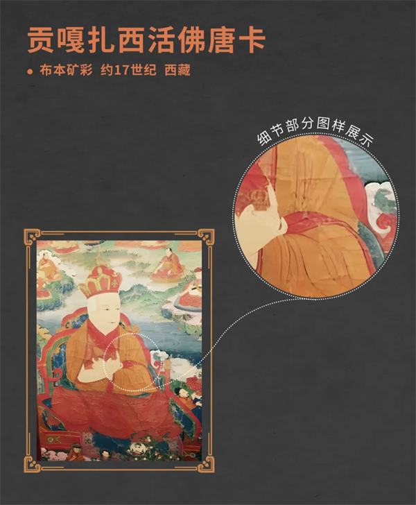 明清时期的唐卡画师们,将规范严谨的造像量度与洒脱飘逸的汉地绘画方式相结合,使得唐卡艺术在规范与自由之间达到了完美的平衡。这种不同民族文化艺术的融合不仅在罗汉图唐卡中有所体现,同样在“贡嘎扎西活佛唐卡”中可见一斑。