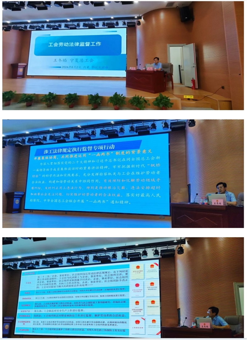 本次会议和培训班在旗工人文化宫举行,来自全旗各基层的工会负责人、劳动法律监督员、工资集体协商指导员及劳动关系协调员共计百余人参加。会议由旗总工会相关负责人主持,特邀宁夏回族自治区总工会二级巡视员、宁夏回族自治区法学会常务理事王冬焰老师进行工会劳动法律监督工作授课。