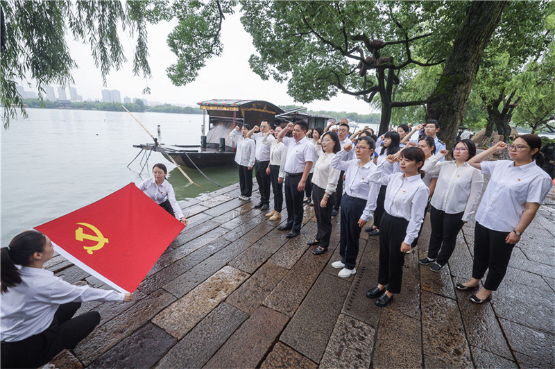 ▲2024年6月28日,党员们在浙江嘉兴南湖红船旁重温入党誓词。 新华社记者 徐昱摄