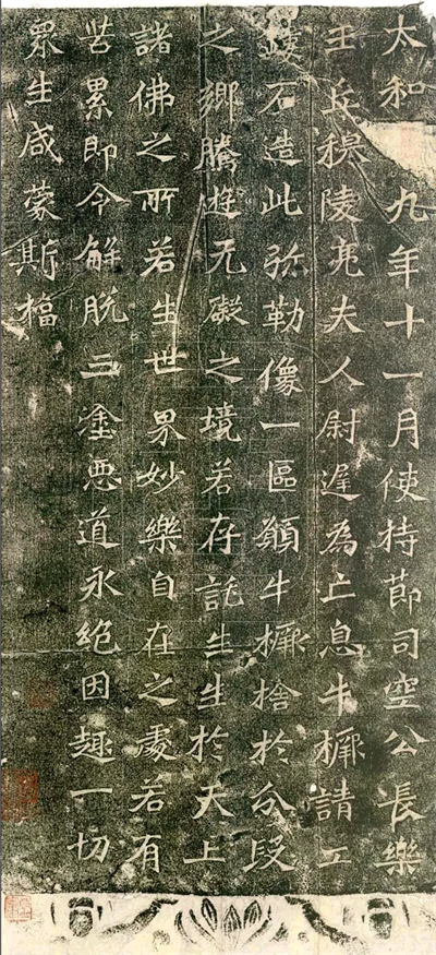 ▲位于洛阳龙门石窟古阳洞的北魏《牛橛造像记》,为龙门石窟中北魏时期“龙门二十品”之一,是魏碑书法的代表作。(图片来源:书法空间网)