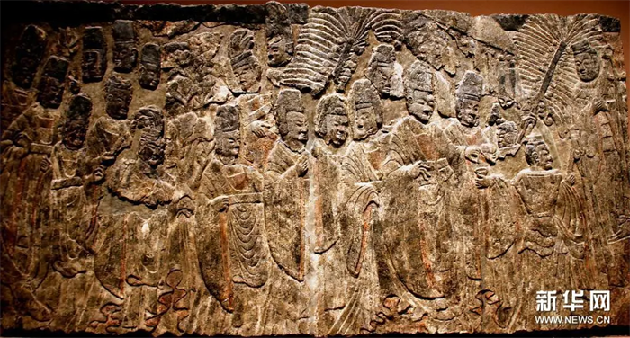 ▲原龙门石窟宾阳中洞东壁上的《魏孝文帝礼佛图》浮雕(后被盗凿,现藏于纽约大都会艺术博物馆),雕刻的是北魏孝文帝和文昭皇后的供养行列。从人物的衣冠发式和仪仗制度看,孝文帝推行汉化的政策已经取得了显著的成果。(图片来源:新华网)