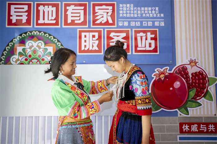 ▲8月23日,在宁夏青铜峡市瞿靖镇毛桥村“异地有家”服务站,来自贵州的苗族务工人员杨文高(左)在给放暑假的大女儿整理服饰。新华社记者 杨植森 摄