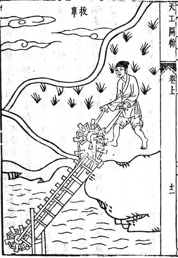 翻车又被称为龙骨水车,据宋应星《天工开物》记载,采用龙骨水车后,一个人工作一天,可以灌溉田地五亩,而用牛则能加倍。
