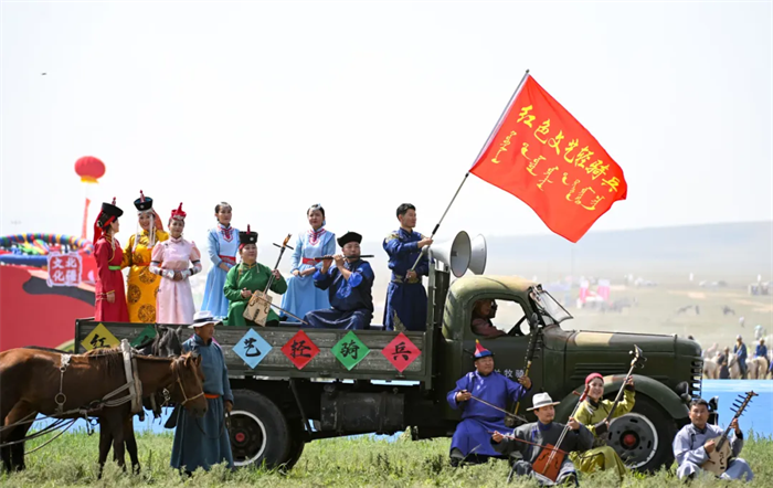 ▲乌兰牧骑队员在“相约草原·遇见那达慕”内蒙古第34届草原那达慕开幕式上表演(2024年7月14日摄)。 新华社记者 贝赫 摄