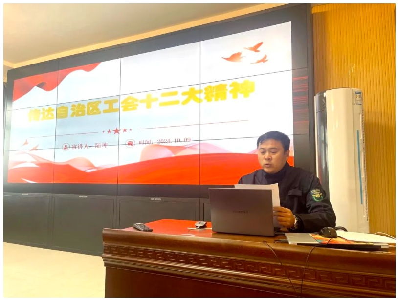 此次宣讲由自治区工会十二大代表、一线职工航空特勤突击队队长陆坤围绕自治区工会十二大主题、大会主要精神,重点就自治区党委领导讲话和全国总工会领导讲话精神、自治区工会十二大工作报告等内容并结合自己参会经历和自身工作,对大会精神进行了专题宣讲。宣讲内容全面细致,宣讲语言大众化,用情用感,主题鲜明、重点突出。
